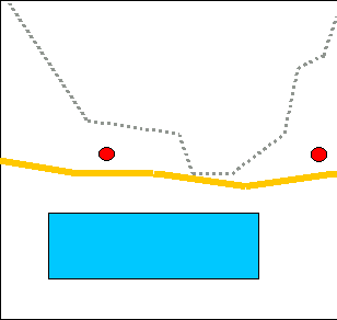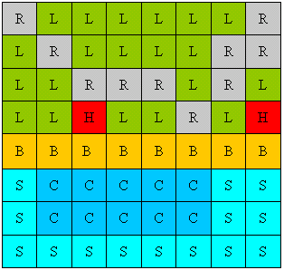 | R = ceļš, L = zeme, H = māja, B = pludmale, C = Aizsargājamā teritorija, S = Jūra |
